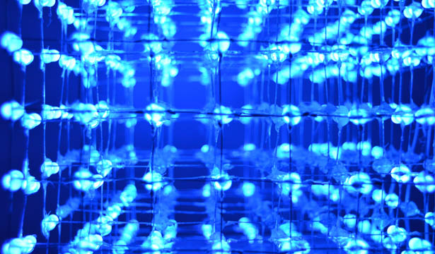 We have a virtual blue cube on the web with a stone on its base. Upon accessing it, the interactor writes a word and chooses a place to put it. The words can overlap, or combine with others spread and scattered around the cube. In the gallery, there is a virtual stone, inside a cube with blue LEDs (8X8X8), which responds to the interventions, varying with the intensity and frequency of light, according to the choices and nominations.