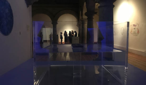 Beside the wall engraved with the Sky Circuit we have a Box with a “time ruler” submersed in water, representing the distance covered by stars in the period (1596-2018). This ruler was used to produce the work Sky Circuit, as measure of displacement of stars over time.